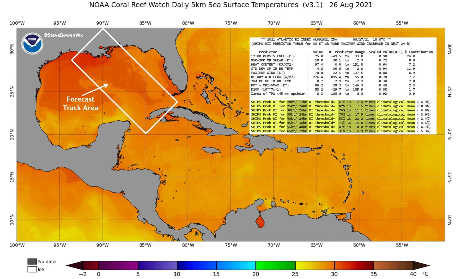 Températures des eaux de surfaces du Golfe du Mexique le 26 août 2021 et trajectoire prévue du cyclone – NOAA