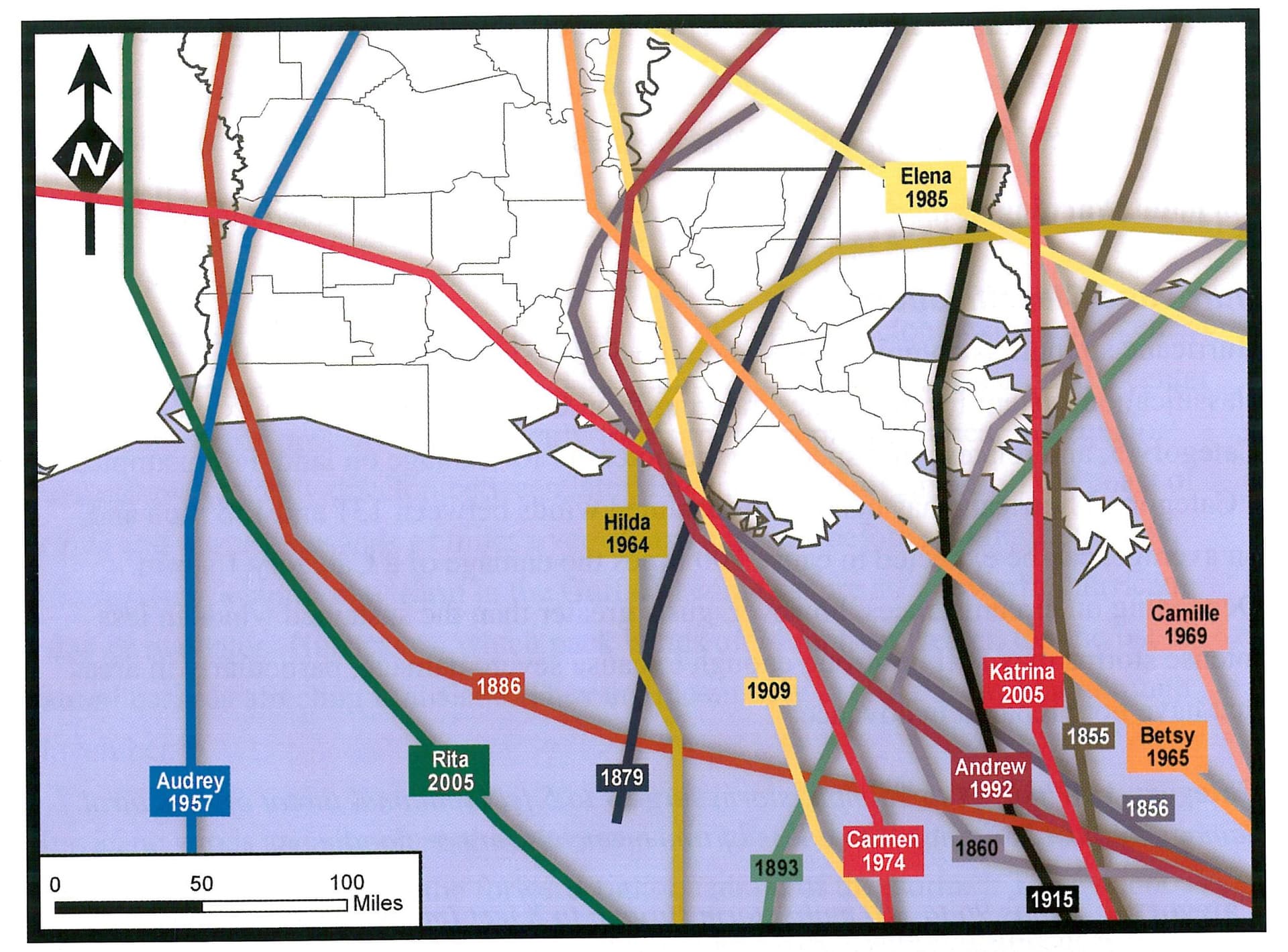 Trajectoires des ouragans majeurs sur la Louisiane entre 1850 et 2005 – NCPTT