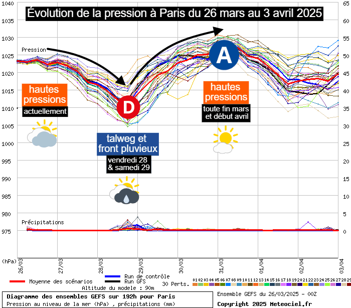 Différents scénarios de pression à Paris du mercredi 26 mars au jeudi 3 avril 2025 - meteociel.fr