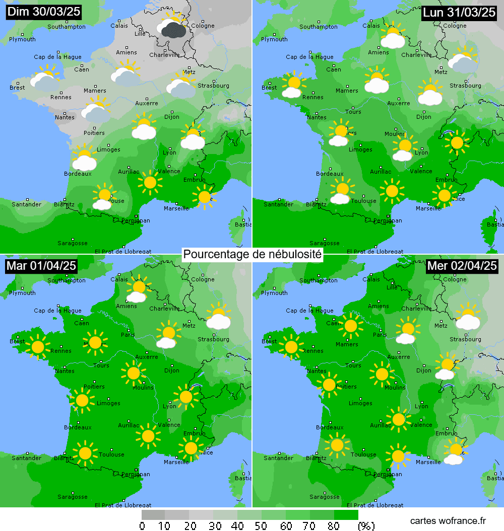 Pourcentage de nébulosité envisagé du dimanche 30 mars au mercredi 2 avril 2025 - wofrance.fr