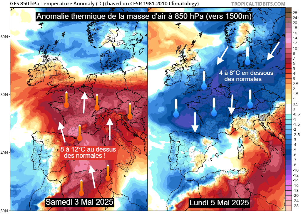 La comparaison ci-dessous montre à quel point la masse d'air va drastiquement changer en moins de 48 heures ! Samedi 3 mai 2025, les températures en altitude (vers 1500m) seront situées 8 à 12°C au dessus des moyennes de saison sur la France. Deux jours plus tard, le lundi 5 mai, elles plongeront 4 à 8°C en dessous des moyennes sur une large moitié nord ! Dans le nord de l'hexagone, la masse d'air perdra 15°C en moins de deux jours !