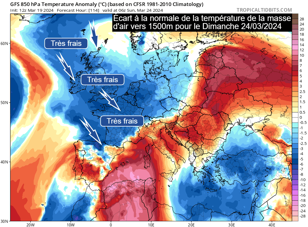 Écart à la normale de la température de la masse d'air vers 1500m le dimanche 24 mars 2024 - via tropicaltidbits.com