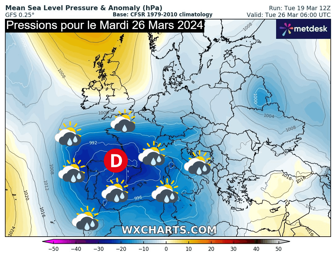 Situation météo à échelle européenne pour le mardi 26 mars 2024 - via wxcharts.com