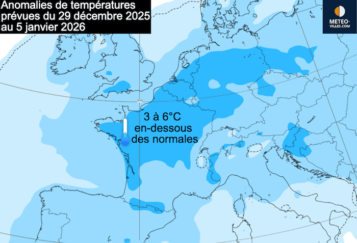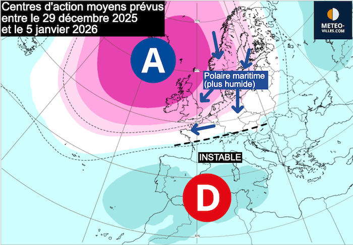 La bascule du courant vers le nord, apportant de l’air polaire plus maritime, prévue dimanche 28 ou lundi 29 décembre, précédait une descente froide potentiellement plus intense.  Bien que tous les scénarios restent envisageables, y compris celui d’une vague de froid plus marquée, il semble que le temps restera froid au moins durant la première semaine de janvier.  L’anticyclone scandinave devrait alors se décaler entre l’Écosse et l’Islande, laissant place à un air légèrement plus humide, mais également plus froid, car il descendrait directement de Scandinavie.