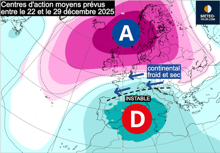 Dans un premier temps, un anticyclone se formera sur les pays scandinaves, tandis qu’une dépression s’installera en Méditerranée.  La France, située entre ces deux centres d’action, favorisant un vrai Moscou-Paris (courant continental, plutôt sec, mais de plus en plus froid).