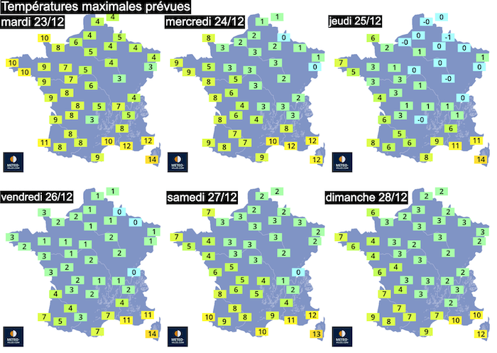 Cette journée de Noël sera particulièrement froide comparée aux températures récentes, bien que nous restions loin des records de froid pour la saison.  Il est possible que les maximales des après-midi aient du mal à dépasser 0°C sur l’ensemble du Nord, du centre et de l’Est.