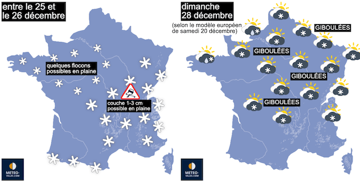 Prévisions de la neige entre le 25 et le 26 décembre ainsi que le dimanche 28 décembre (principalement par le modèle météo ECMWF).