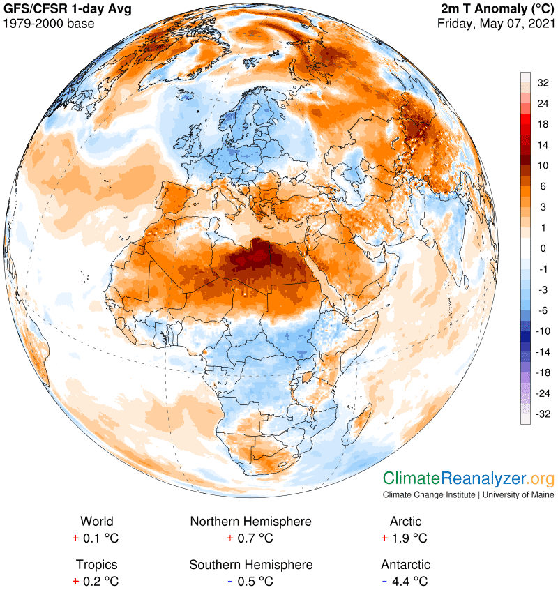 Anomalies de températures sur l’Europe et l’Afrique ce vendredi 7 mai 2021 – climatereanalyzer