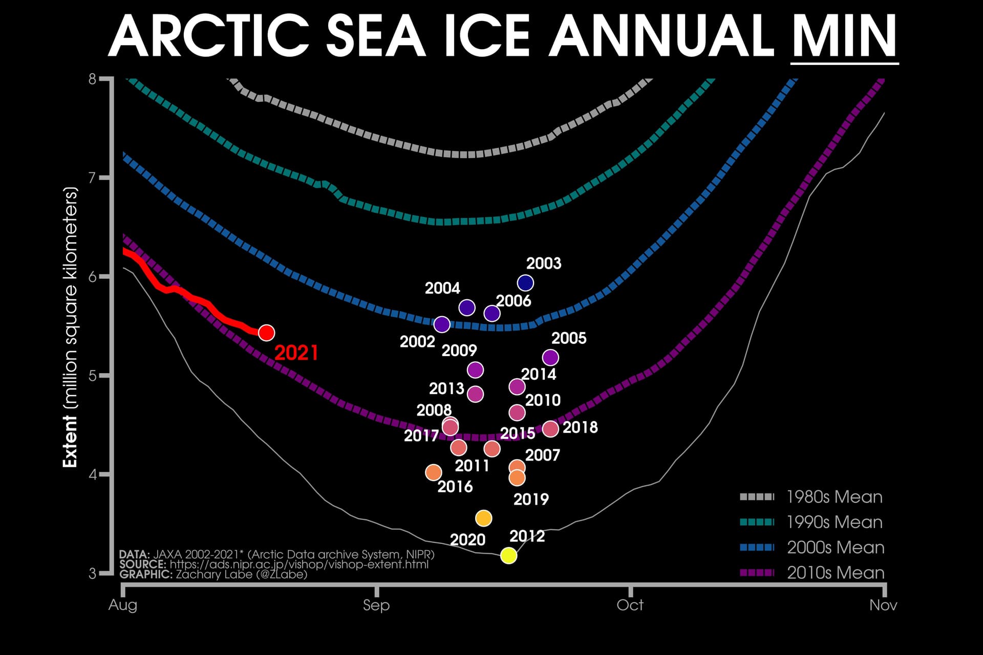 Minimum annuel de l'extension des glaces arctiques depuis le début des années 2000 et moyennes décennales depuis 1980 – Zachary labe