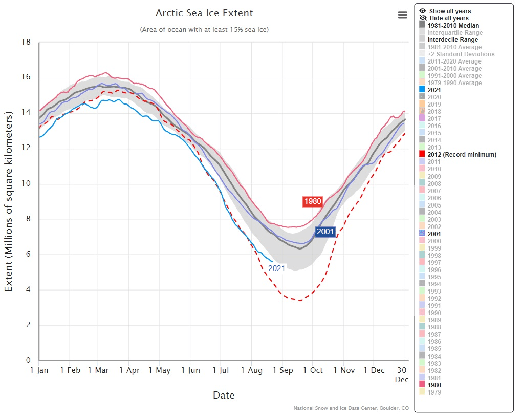 Autre exemple, le minimum annuel durant l'année 2001 avait été de 6,603 millions de km² et durant l'année 1980 celui-ci atteignait 7,544 millions de km², soit autant que le 19 juillet 2021, à 2 mois de la date du minimum annuel !