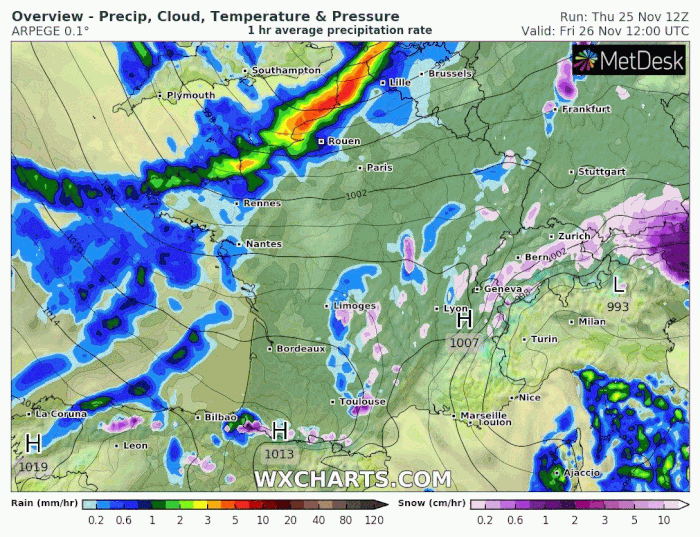 Précipitations en France du vendredi 26 au mardi 30 novembre 2021 (violet = neige) - via wxcharts.com