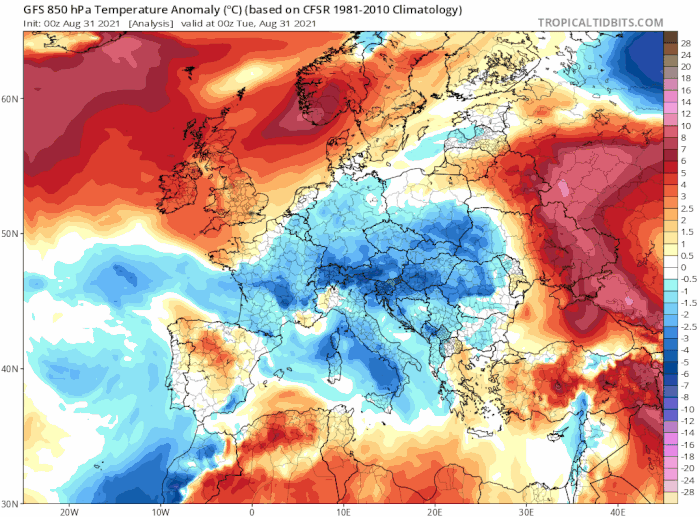 Anomalies thermiques hebdomadaires en août 2021 - modèle américain via tropicaltidbits.com