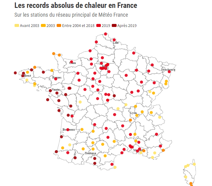 Ancienneté des records absolus de chaleur en France - carte via Ouest-France