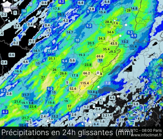 Les orages n'ont engendré des cumuls importants que dans le massif du Jura où les cumuls auront atteint 115mm à la station de Nanchez (39).