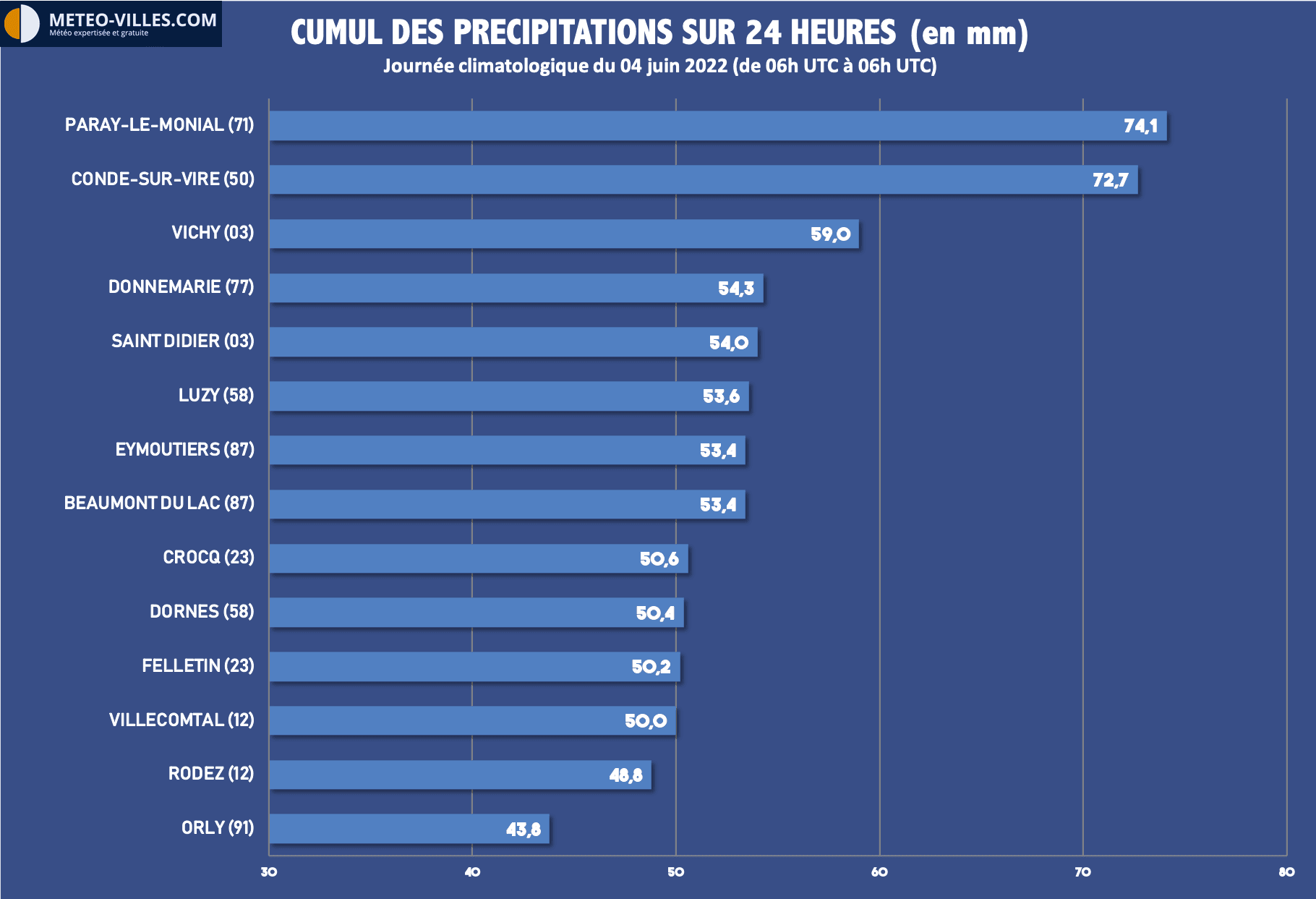 Comme la veille, ces orages ont donc apporté d'importantes quantités de pluie de façon localisée. Plusieurs stations ont notamment récolté plus de 50mm sur la journée dans le Limousin, l'Auvergne, en Bourgogne ou encore en Normandie. Il est notamment tombé 72.7mm à Condé-sur-Vire (Manche) ou encore 74.1mm à Paray-le-Monial (Saône-et-Loire), soit 106.8mm en l'espace de deux jours sur cette dernière !