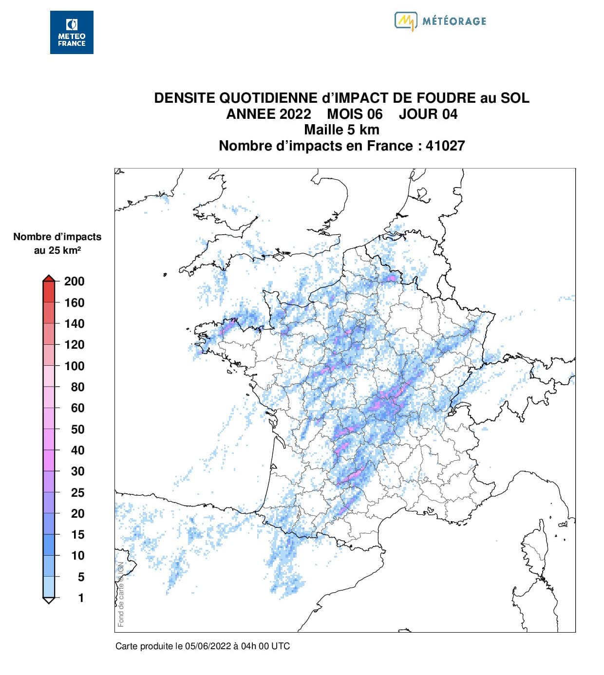 Après les 23.462 impacts de la veille, ce ne sont pas moins de 41.027 impacts de foudre qui ont été recensés à travers l'ensemble du territoire lors de cette journée du 4 juin, faisant de ce samedi la journée la plus foudroyée de l'année à ce jour !