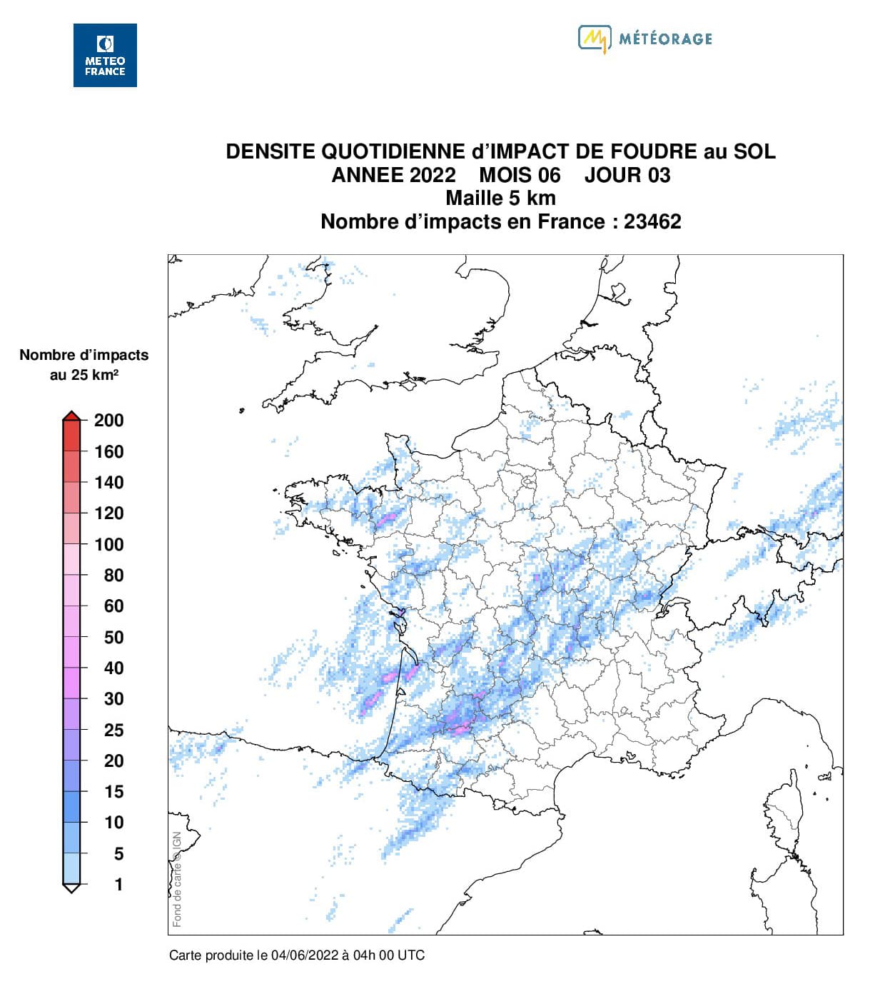 Au total, pas moins de 23.462 impacts de foudre ont été recensés sur cette seule journée du 03 juin, soit la deuxième journée la plus foudroyée de cette année 2022 (après le 04 juin, voire en fin d'article).