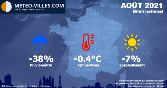 Avec une température moyenne de 20.0°C à l'échelle nationale, le déficit thermique s'est élevé à -0.5°C en août 2021. Il s'agit du mois d'août le plus frais depuis 2014 en France, et fait suite à un été 2020 radicalement opposé (température moyenne de plus de 22.5°C).
