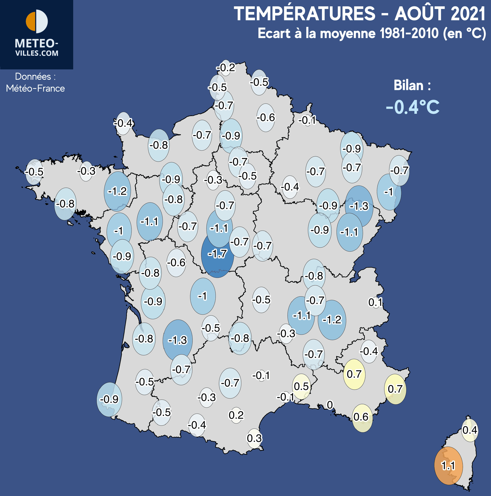 Les seules villes a avoir observé des températures dans les normes attendues d'un mois d'août se situe autour de la Méditerranée. La Provence et la Corse notamment sortent du lot, avec une légère anomalie positive (+0.6°C à Hyères, +0.7°C à Saint-Auban et Nice, jusqu'à +1.1°C à Ajaccio).