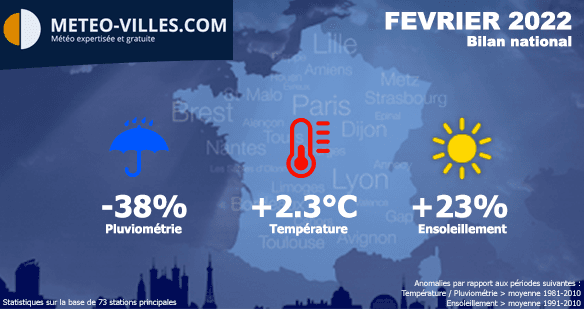 Comme à chaque début de mois, nous vous proposons un bilan climatologique du mois écoulé. Place donc au bilan cartographié du mois de FÉVRIER 2022 en termes de température, pluviométrie et ensoleillement sur un panel de 73 stations*.
