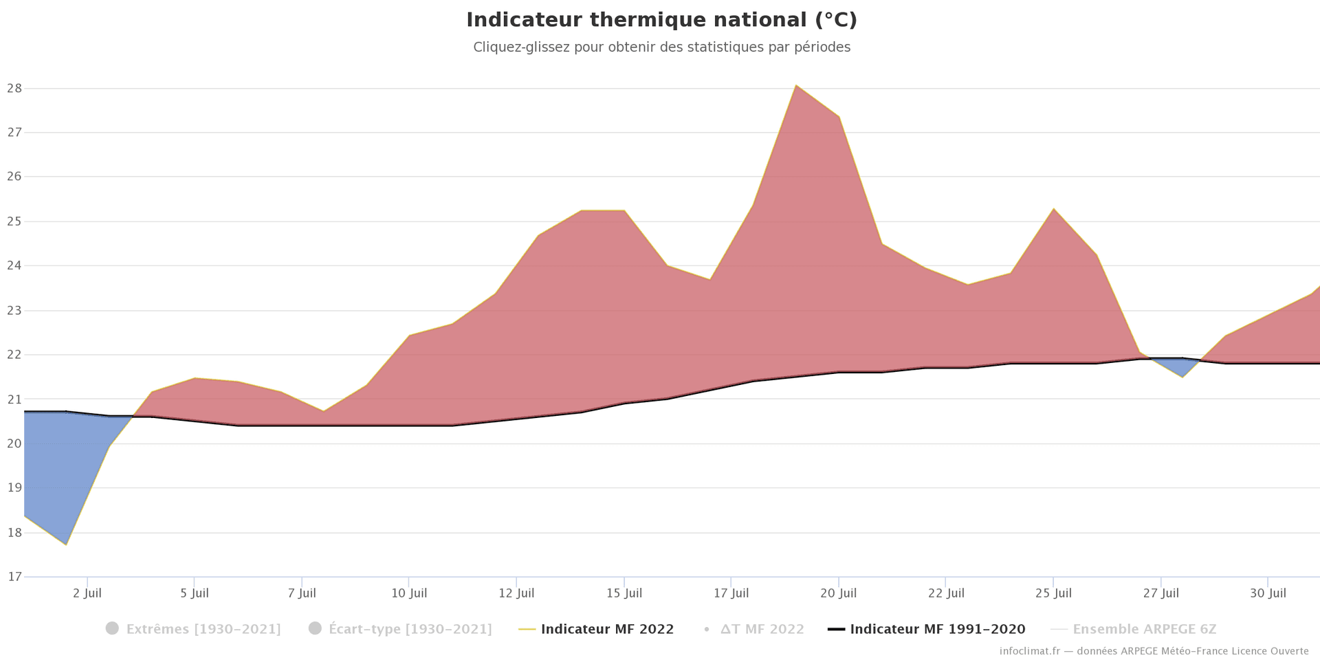 Hormis une très brève et insignifiante période fraîche lors des 3 premiers jours du mois, nous sommes restés en excédent thermique durant la quasi-intégralité de juillet. Entre le 10 et le 26 juillet s'est notamment produite la seconde vague de chaleur de cet été 2022, avec en point d'orgue le pic caniculaire exceptionnel et la vigilance rouge du 19 juillet marqué par des records absolus à la pelle sur la moitié Ouest du pays (plus de 40°C en Bretagne, jusqu'à 42°C en Aquitaine et dans les Pays de la Loire >>).