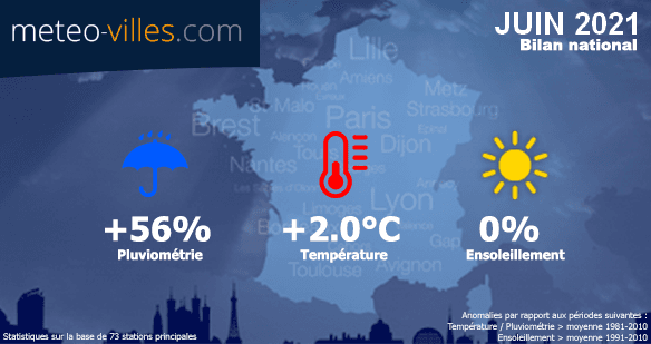 Malgré une impression générale de mois de juin plus frais que la normale en raison d'une instabilité très récurrente et parfois violente, l'anomalie thermique par rapport à la moyenne 1981-2010 atteint +2.0°C, ce qui place juin 2021 en 5ème position des mois de juin les plus chauds depuis 1950, devant juin 2019 qui avait pourtant connu une canicule exceptionnelle.