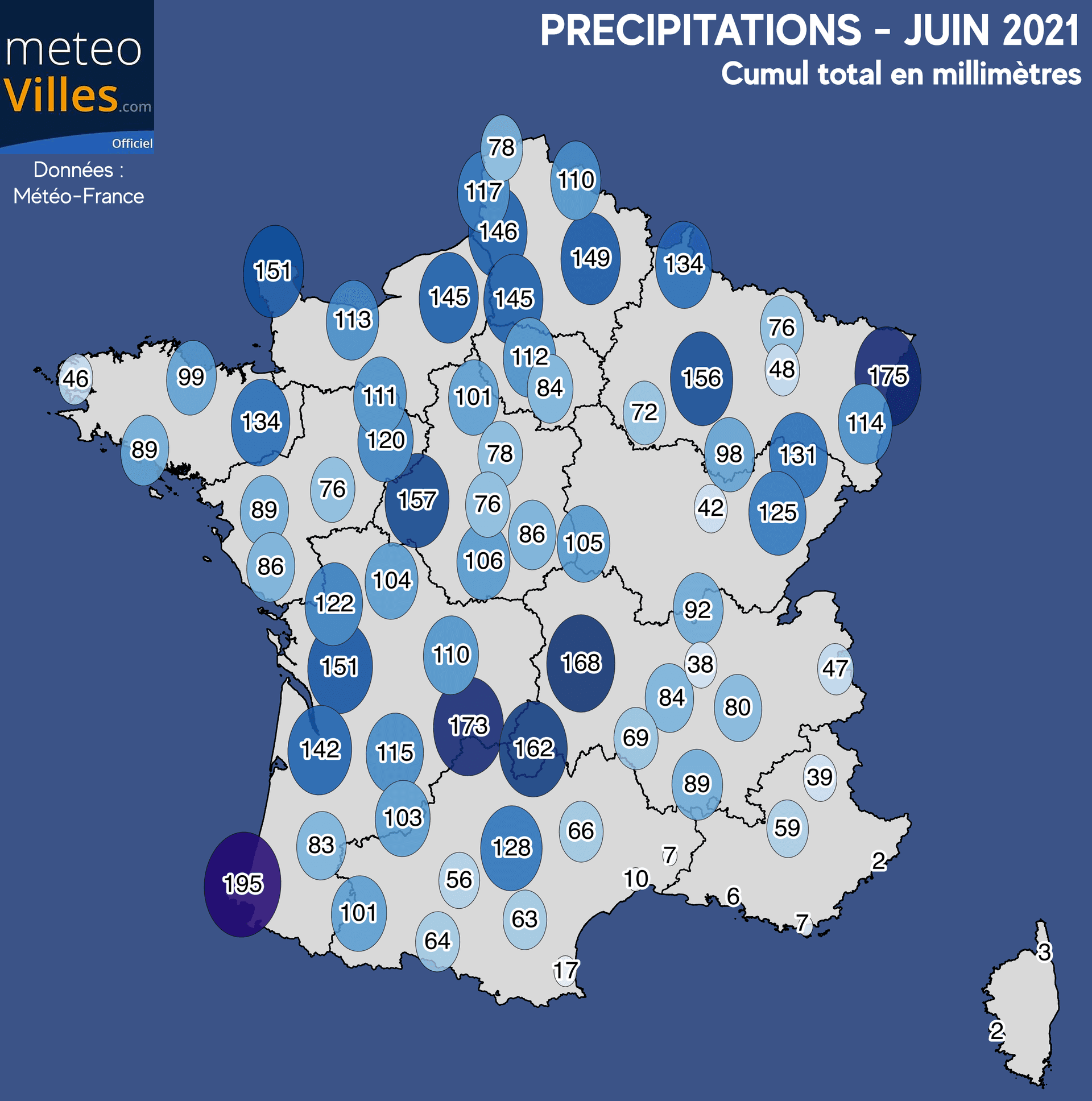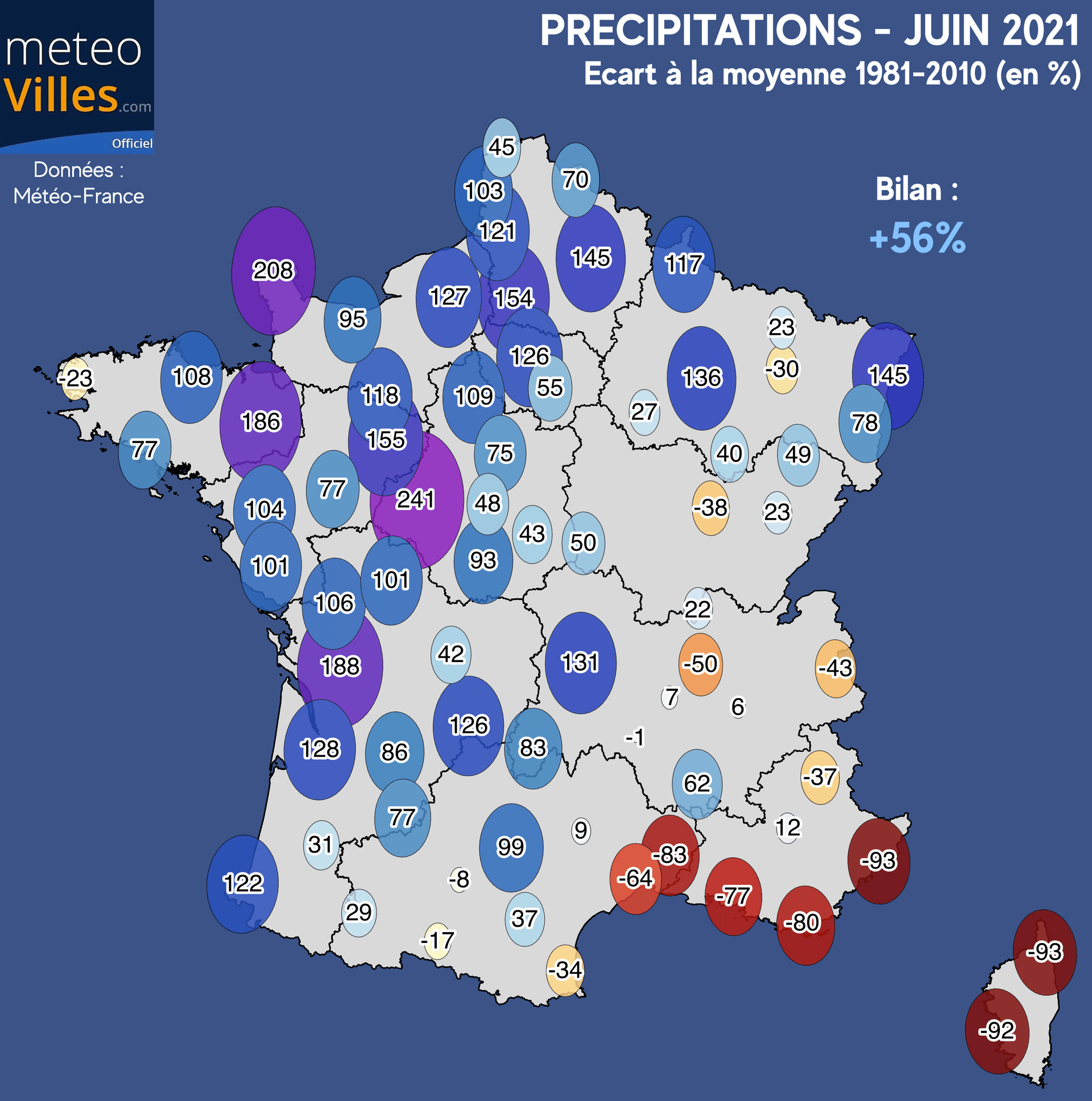 Sur notre panel de station, la pluviométrie se trouve être en excédent de +56% à l’échelle nationale. Les régions du Nord et du Sud-Ouest furent les plus concernées, notamment entre les pays de la Loire et le Cotentin avec un excédent de +208% à Cherbourg, +186% à Rennes ou encore +241% à Tours. Notons également +145% ) Strasbourd, +126% à Paris ou encore +188% à Cognac. De nombreux records de précipitations mensuels ont d'ailleurs été battus comme à Rennes, Tours ou encore Gonneville.