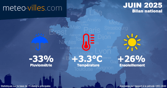 Comme à chaque début de mois, nous vous proposons un nouveau bilan climatologique. Place désormais au bilan cartographié de JUIN 2025 en termes de température, pluviométrie et ensoleillement sur un panel de 73 stations*. Les anomalies présentées sont calculées à partir des moyennes climatiques de la période de référence 1991-2020 sur l'ensemble des stations du panel.