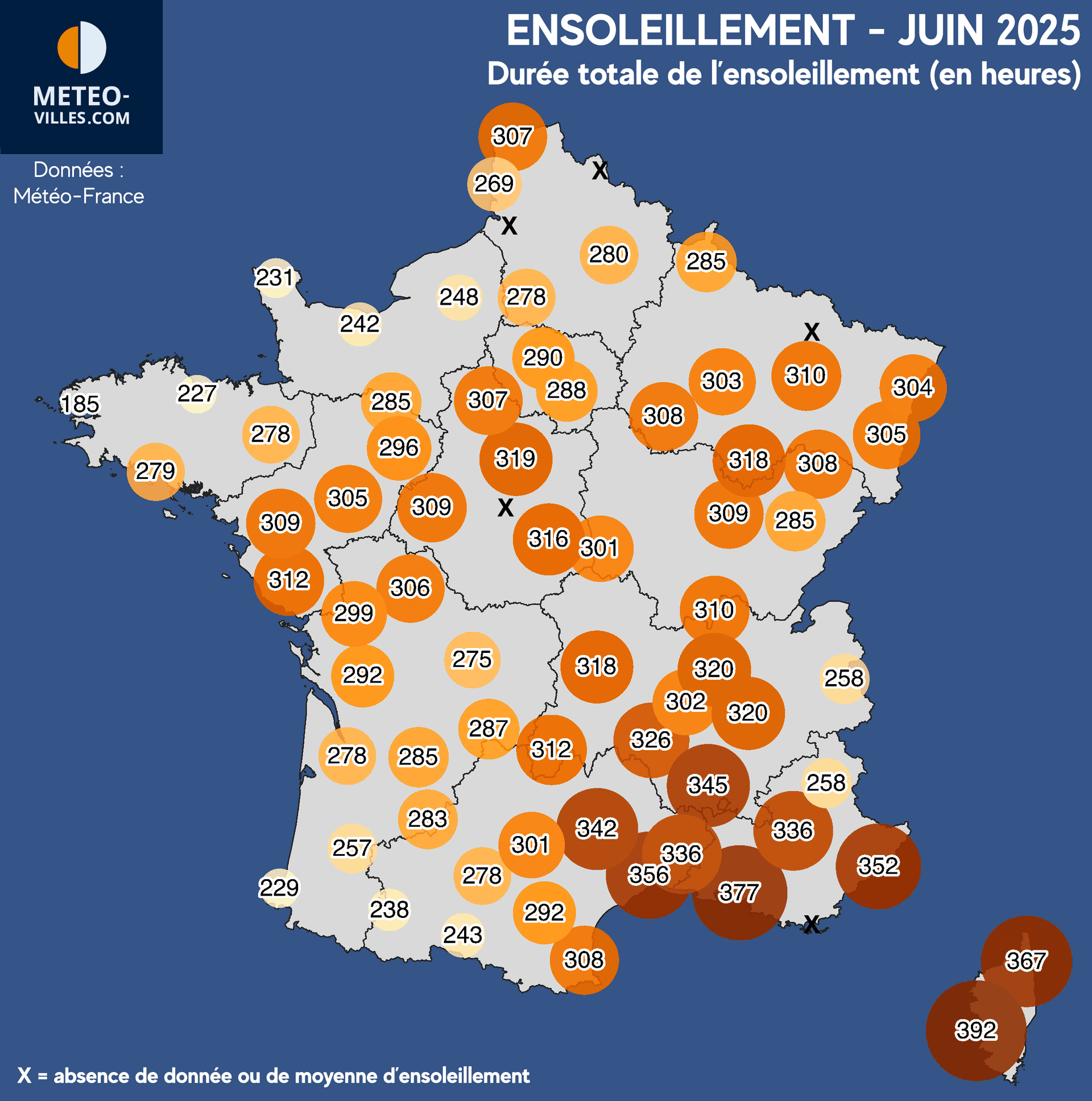 C'est toutefois comme bien souvent près de la Méditerranée où ce soleil a le plus brillé au cours de ce premier mois de l'été météorologique, avec plus de 350h d'ensoleillement sur le Languedoc, en Provence, Côte d'Azur et Corse (356h à Montpellier, 367h à Bastia, 377h à Marseille-Marignane et 392h à Ajaccio pour le maximum national).