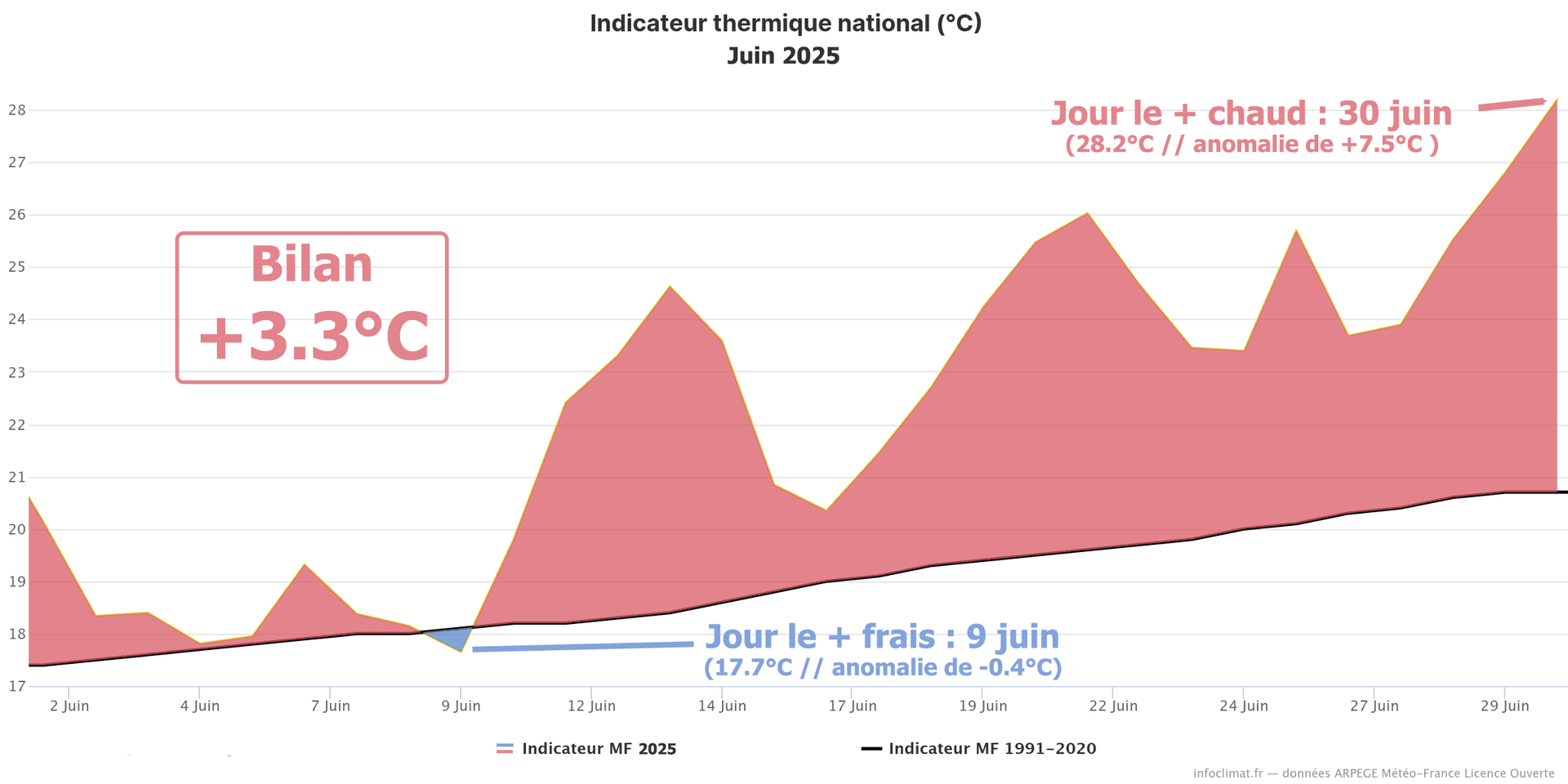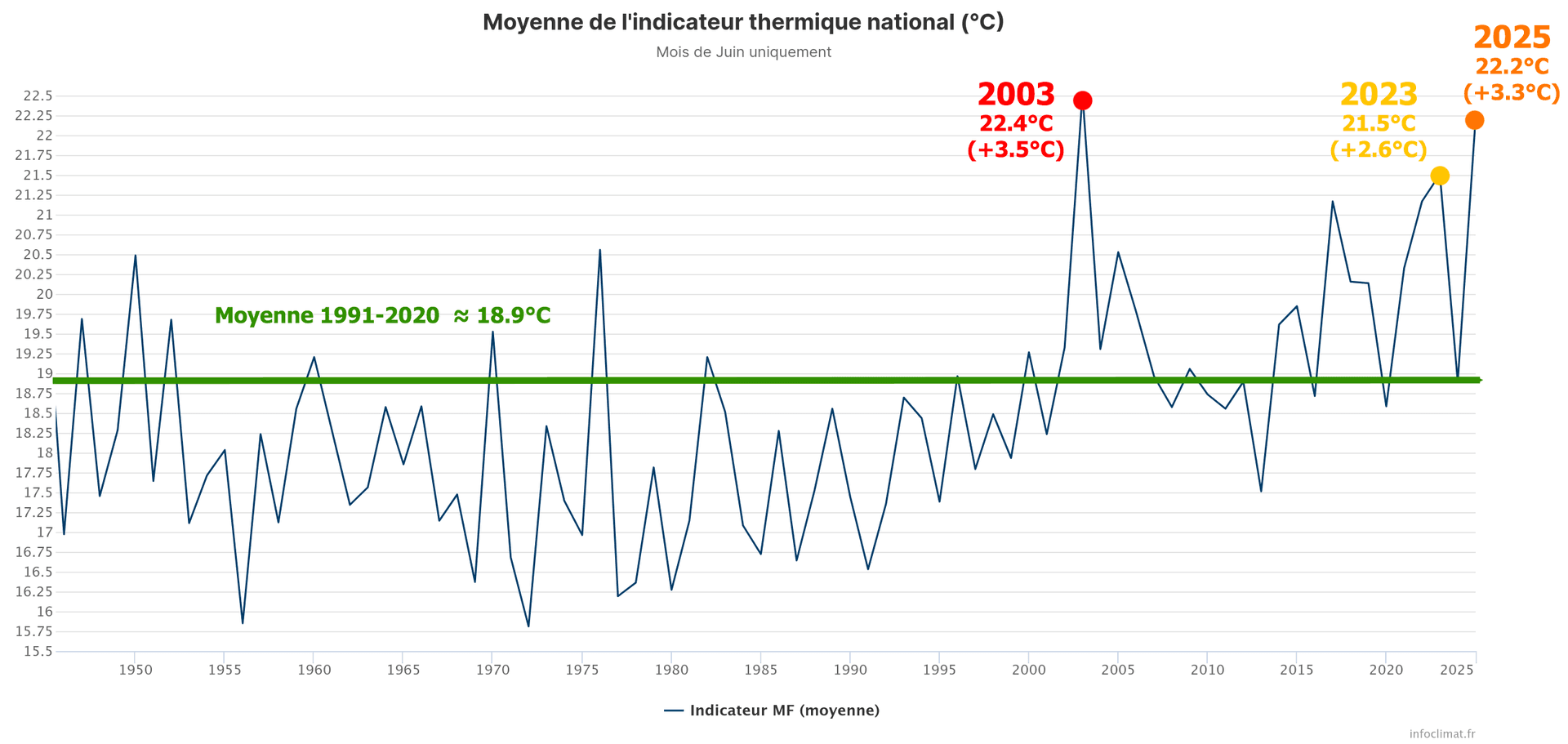 Indicateur thermique national pour juin 2025 depuis l'après-guerre (1945) - Infoclimat