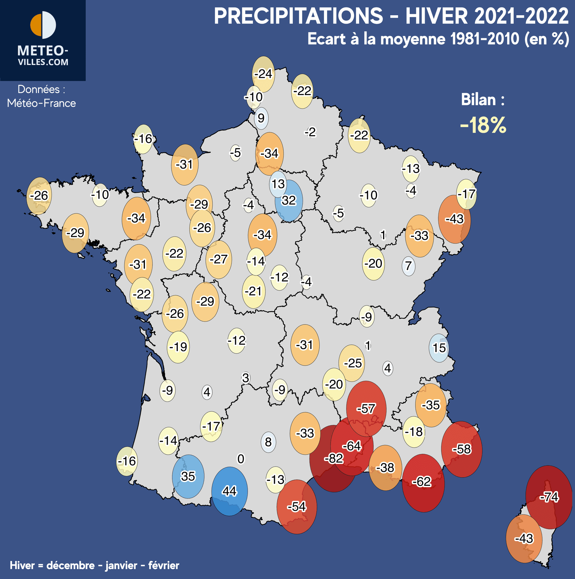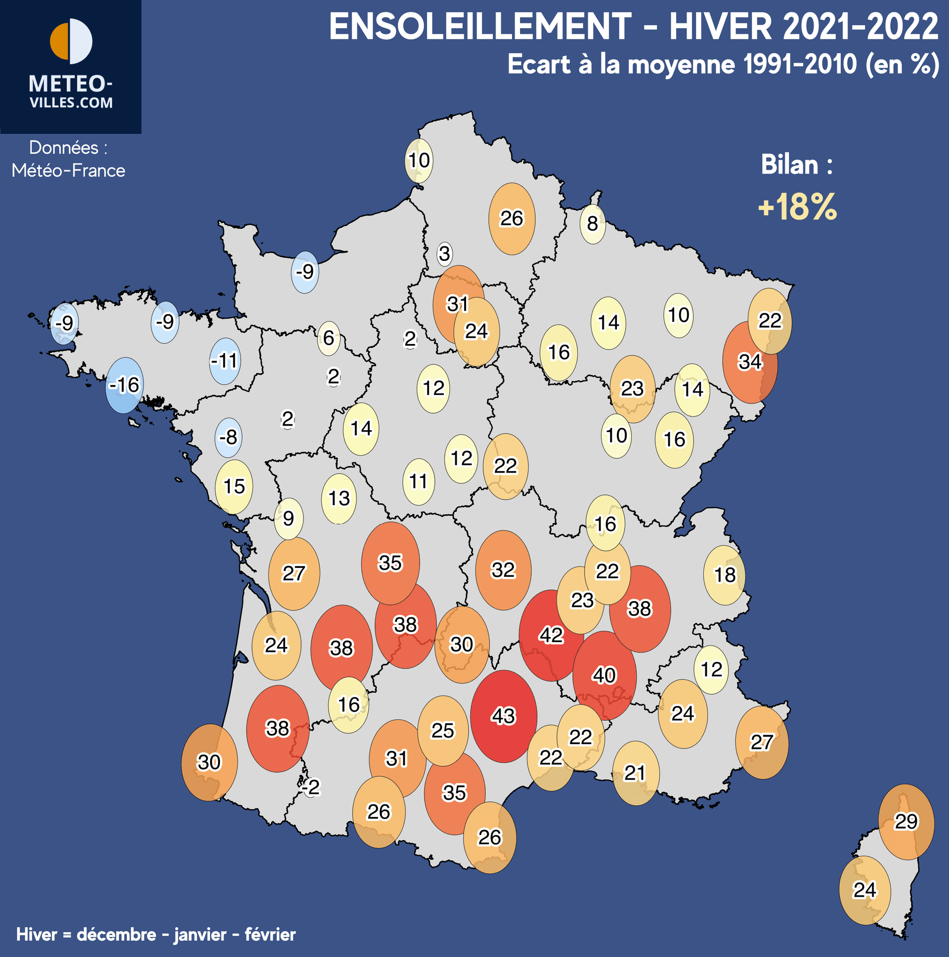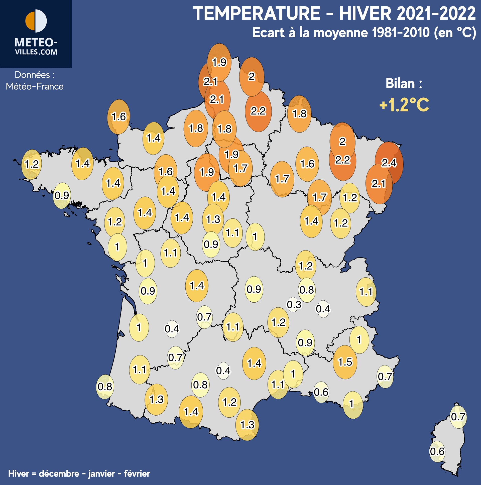 Comme à chaque début de mois, nous vous proposons un nouveau bilan climatologique. Place désormais au bilan cartographié de l’ HIVER 2021-2022 en termes de température, pluviométrie et ensoleillement sur un panel de 73 stations*. Pour rappel, l'hiver météorologique comprends les mois de décembre, janvier ainsi que février.