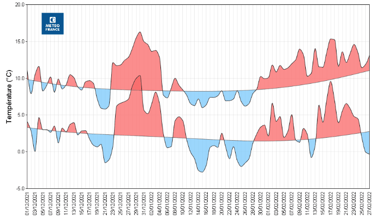 Les fêtes de fin d'année puis début janvier (>>) ainsi que le mois de février dans sa globalité ont été particulièrement doux. Les séquences fraîches se sont concentrées principalement du 20 au 22 décembre (>>), ainsi que du 12 au 27 janvier avec une forte récurrence de gelées matinales (>>). Voici le récapitulatif thermique des trois mois de l'hiver 2021-2022