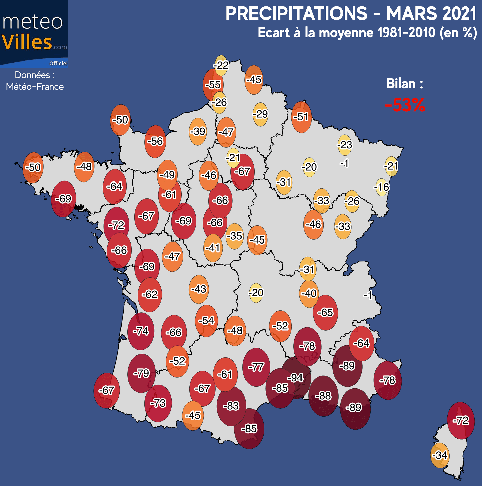 Après des mois de décembre et janvier exceptionnellement arrosés (respectivement +57% et +43%), la fin de l’hiver avait marqué un début de retournement de situation avec des conditions plus sèches (-17%). Ce bouleversement s’est très largement confirmé en ce mois de mars 2021 qui s’est avéré particulièrement sec : avec une anomalie atteignant -53% sur notre panel de stations, il s'agit du 8e mois de mars le plus sec depuis 1959. Le record étant toujours détenu par le mois de mars 1961 avec déficit supérieur à 80%.