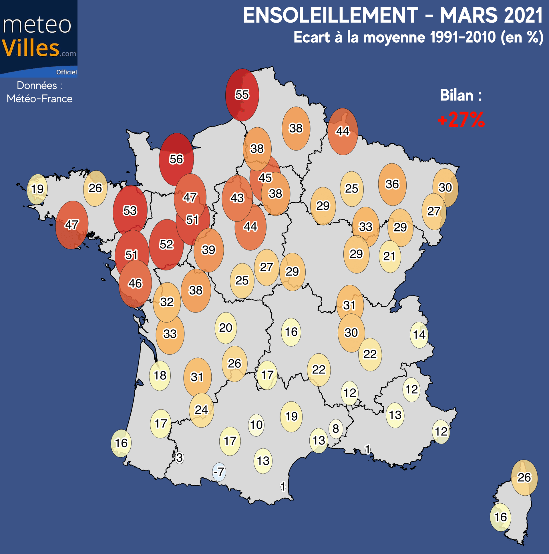 Des conditions peu perturbés, globalement anticycloniques... Ceci rime généralement avec la présence du soleil, notamment à l'approche du printemps. Et en effet, l'ensoleillement a été particulièrement généreux lors de ce mois de mars 2021 avec un excédent national de +27% sur notre panel de stations.
