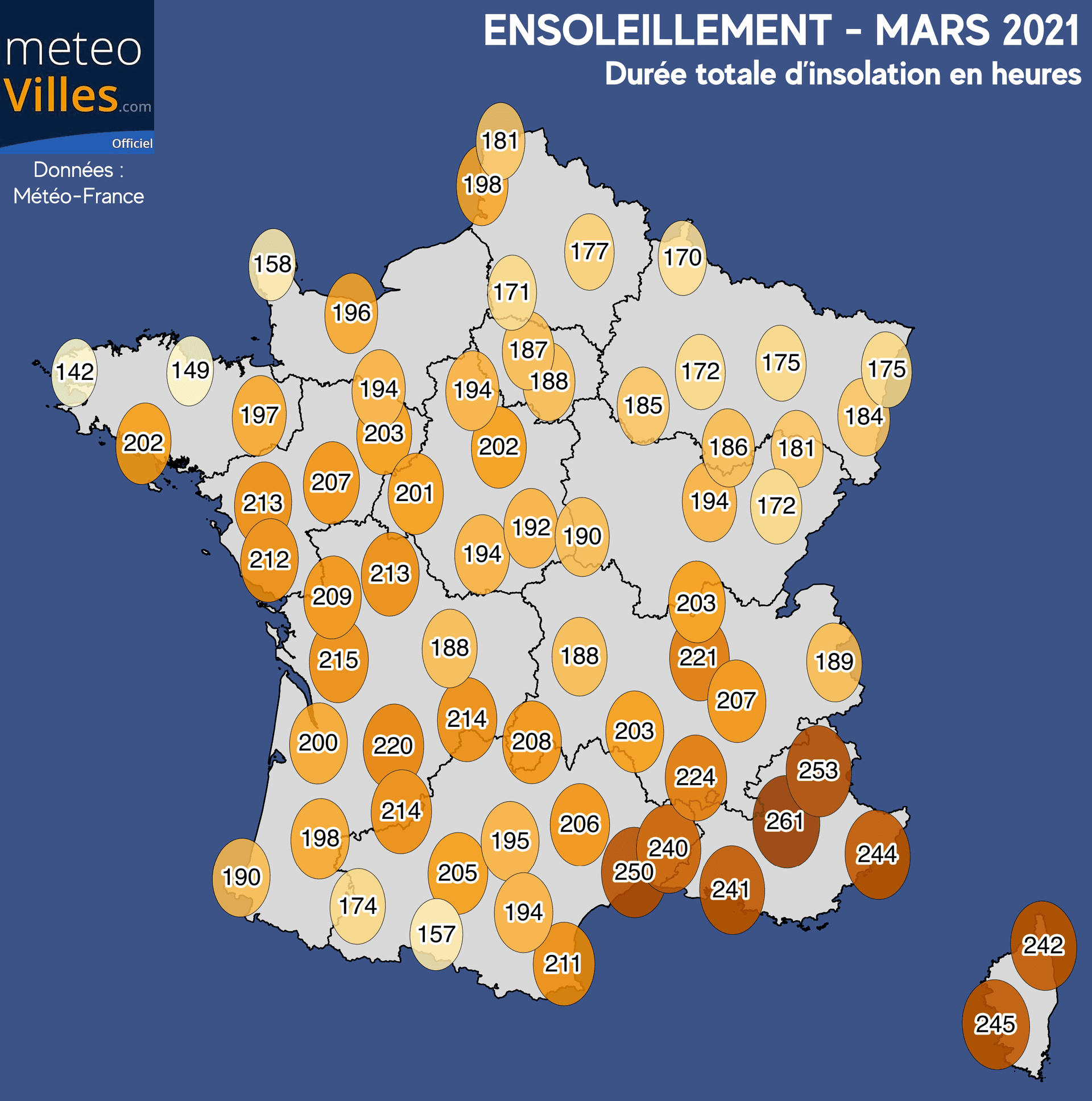 Comme à chaque début de mois, nous vous proposons un bilan climatologique du mois écoulé. Place donc au bilan cartographié du mois de MARS 2021 en termes de température, pluviométrie et ensoleillement sur un panel de 73 stations*.