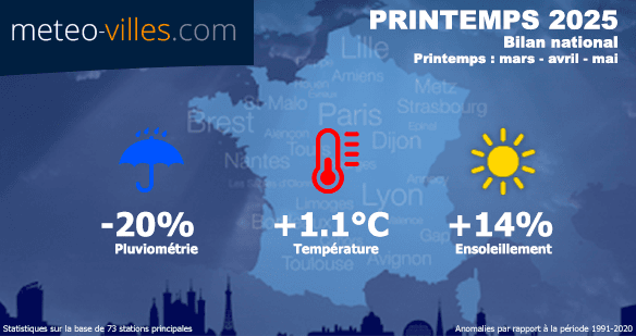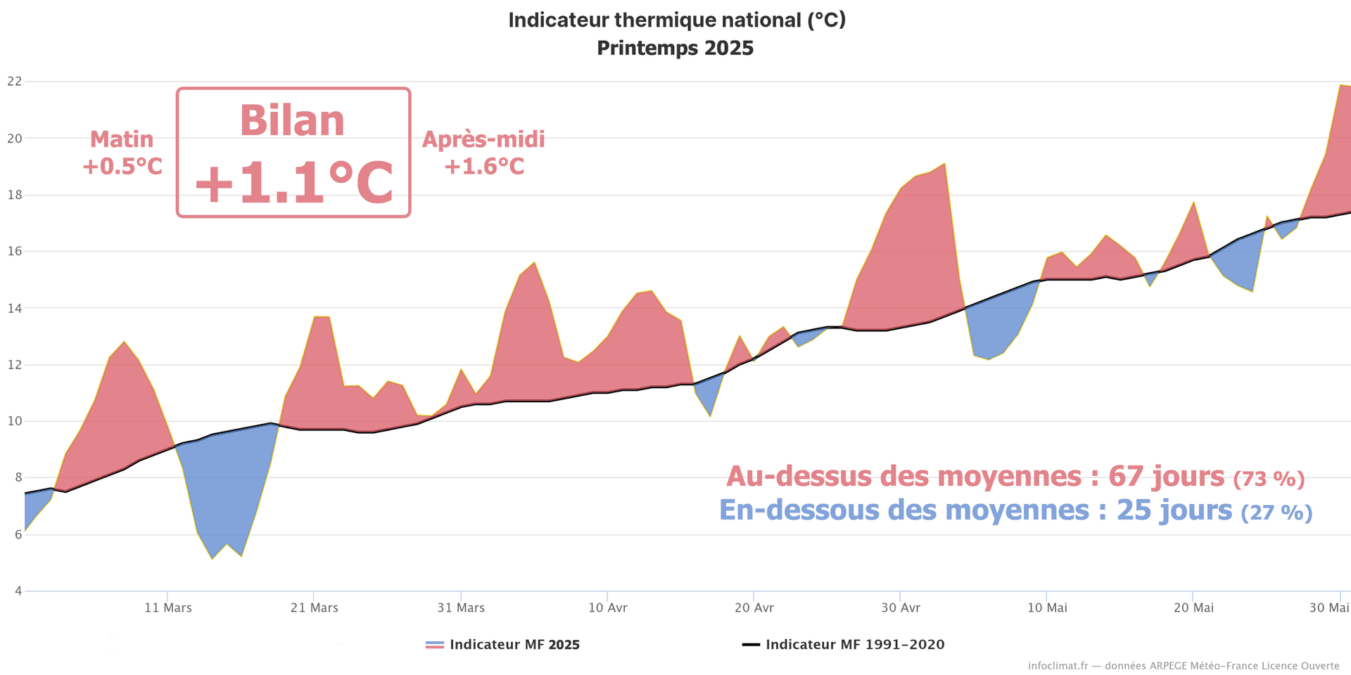 Voici le récapitulatif thermique des trois mois du printemps météorologique 2025 sur notre panel de 73 stations :