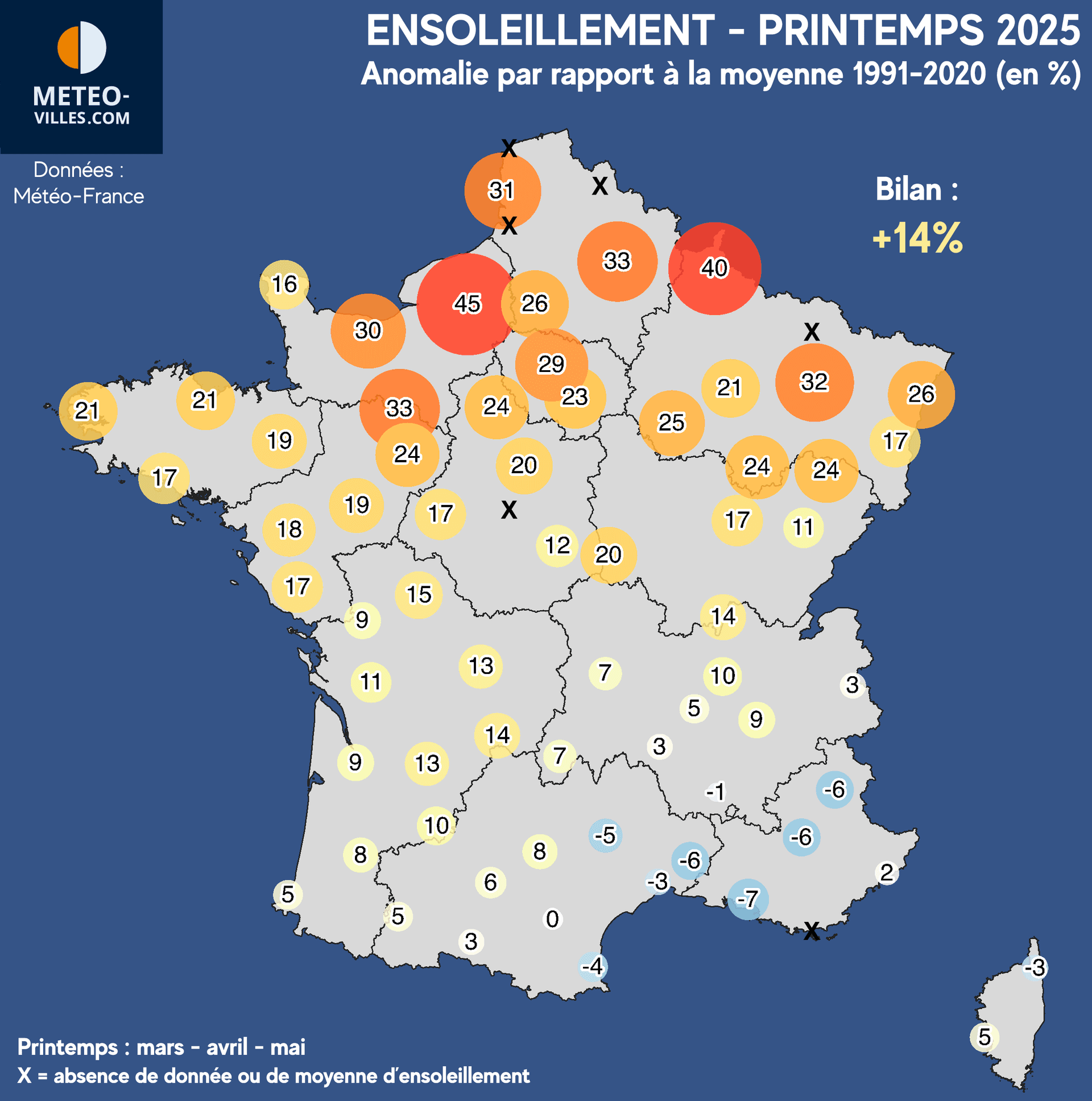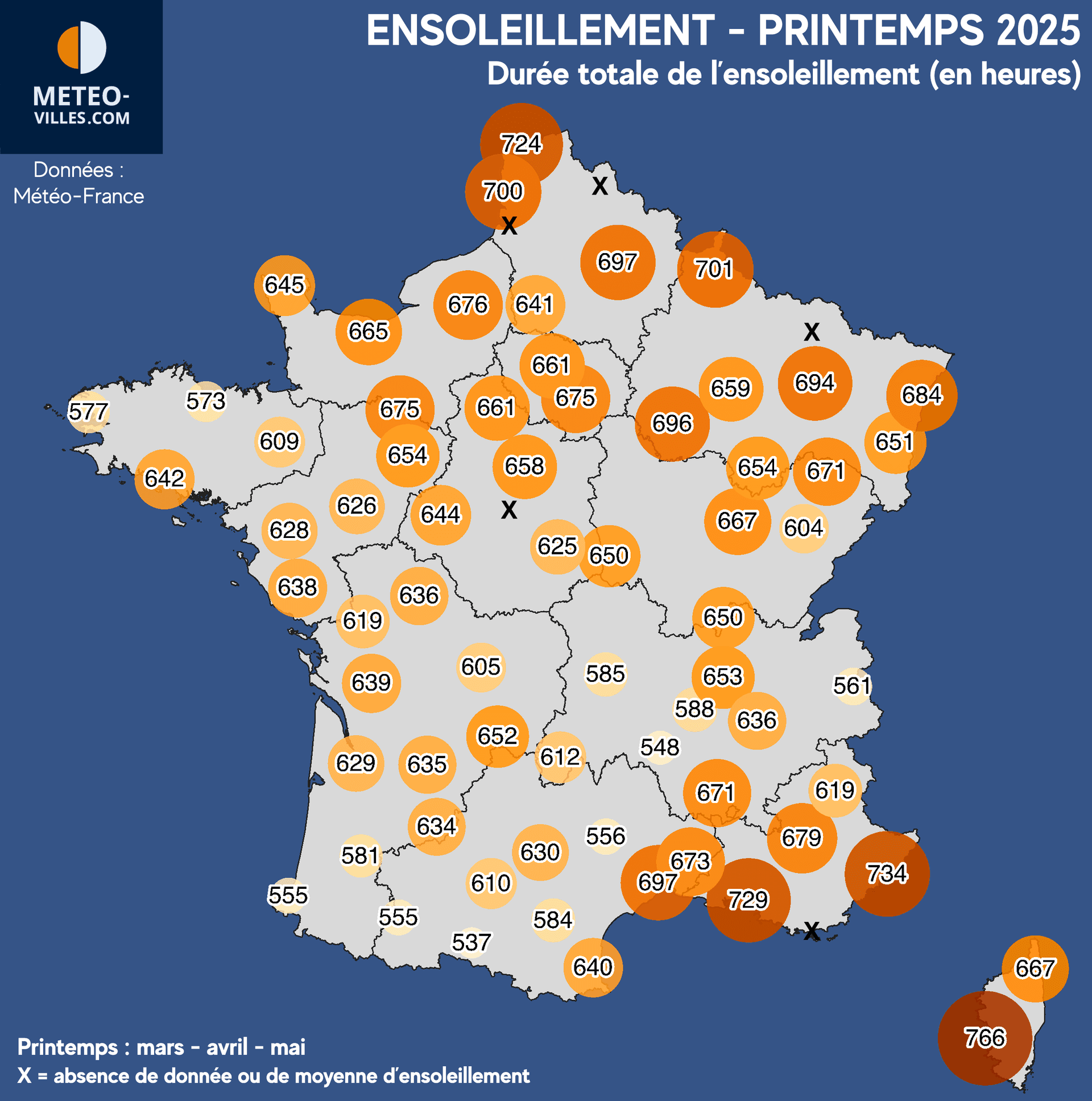 Voici le récapitulatif d'ensoleillement des trois mois du printemps météorologique 2025 sur notre panel de stations :