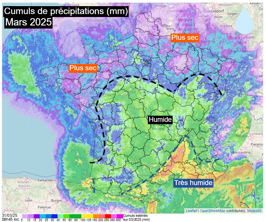 Cumuls de précipitations sur la France en mars 2025 – Meteo60.fr