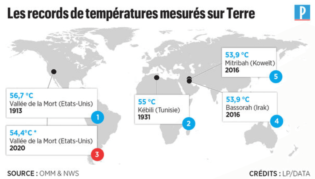Records de températures maximales de l'air à travers la planète - OMM & National Weather Service via Le Parisien