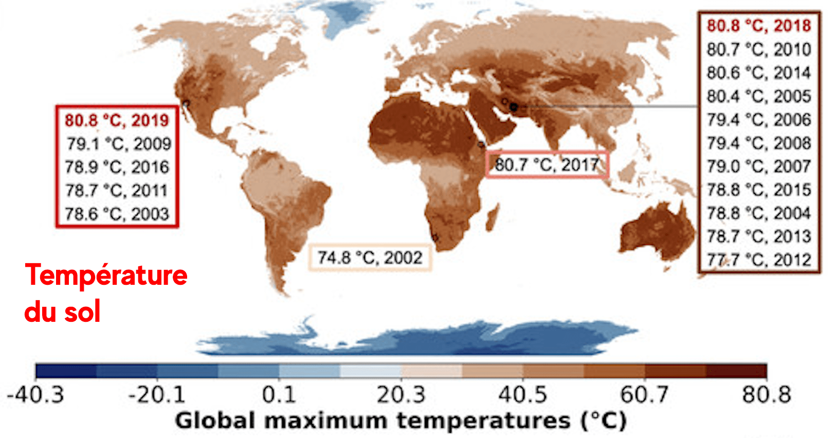 D'après une publication scientifique parue en 2021 dans la revue "Bulletin of the American Meteorological Society", un double record de chaleur des sols a été mesuré récemment : les satellites ont notamment effectué une mesure du sol à 80.8°C en 2018 dans le désert Iranien de Lout, puis l'année suivante au milieu du désert Mexicain de Sonora.