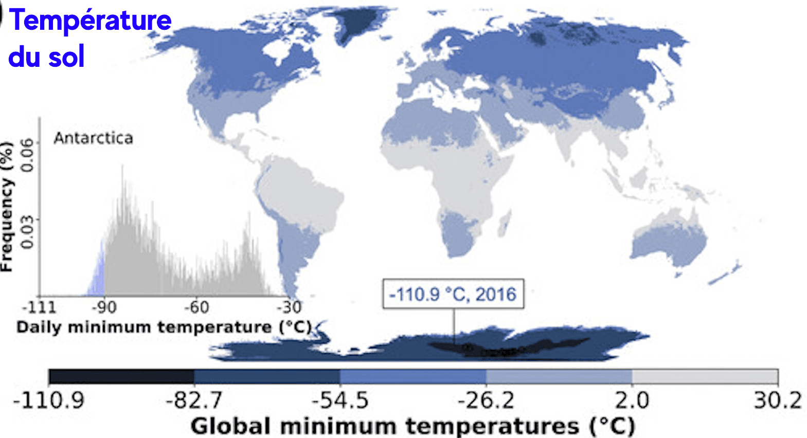 Inversement, le record de la plus basse température des sols à travers la planète a été effectuée au niveau des glaces de l'Antarctique, avec une valeur de -110.9°C en 2016. Une valeur extrêmement froide s'expliquant par l'effet de rayonnement décuplé sur ces sols enneigés, et par l'absence d'ensoleillement durant la période hivernale près du pôle Sud.