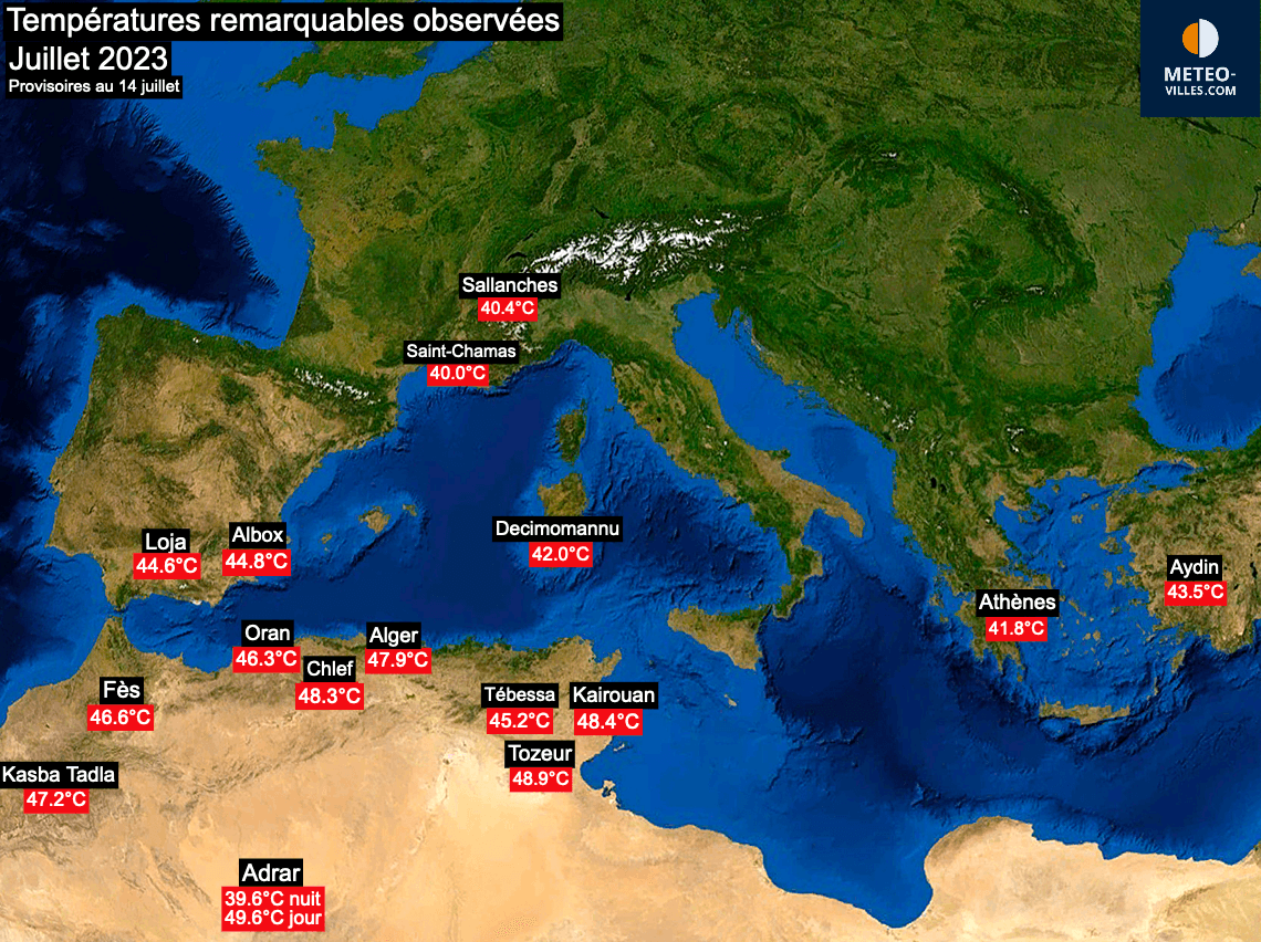 Mais c'est véritablement au Maghreb où les températures atteignent des niveaux exceptionnels, battant par endroit des records absolus. Il a notamment été mesuré jusqu'à 48.9°C à Tozeur (Tunisie), 47.9°C à Alger, ou encore 49.9°C à Smara (Sahara occidental). A noter une valeur exceptionnel à Adrar (Algérie, au coeur du désert) avec une minimale de 39.6°C en pleine nuit, un record absolu pour tout le continent Africain.