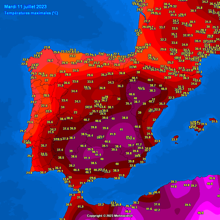 Température maximale de l'air en Espagne - mesures du 11 juillet 2023 - Météociel