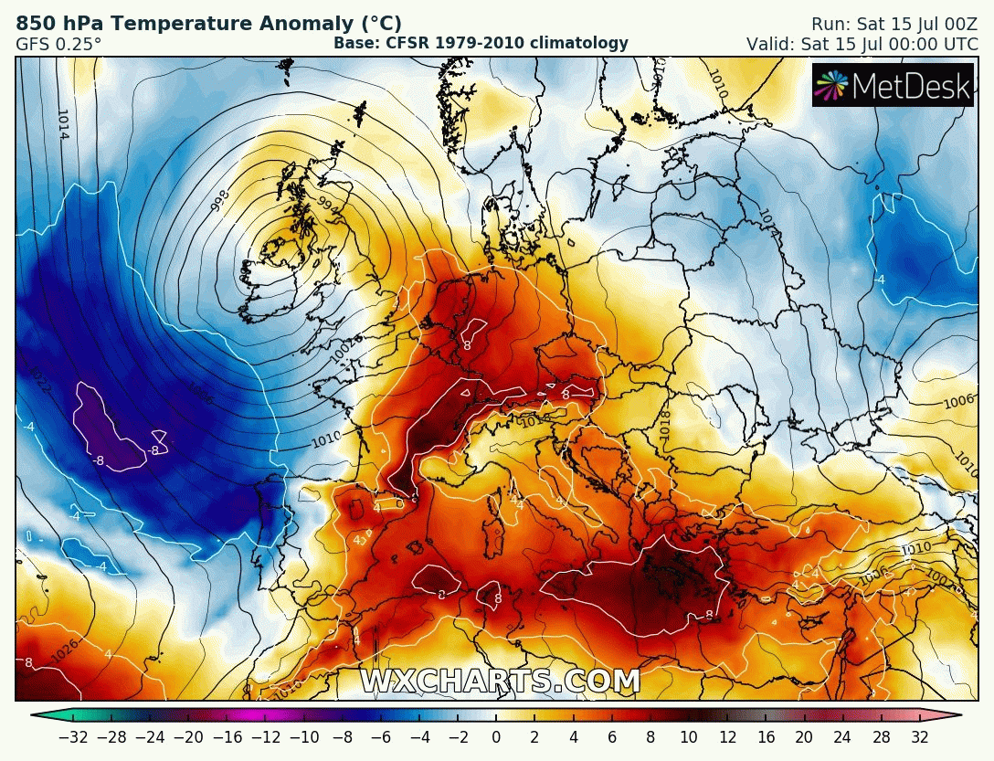Et la situation ne va pas en s'améliorant. C'est en effet une canicule exceptionnelle de par son intensité et sa durée qui s'annonce sur ces mêmes secteurs. Un incroyable dôme de chaleur (température de la masse d'air atteignant les 30°C à 1500m d'altitude, un record sur ces zones) va s'installer durant la totalité de la semaine à venir. Dès lors, des températures durablement chaudes s'annoncent sur l'Ouest du bassin, avec des valeurs supérieures à 43-44°C durant 6 à 8 jours sur le Sud de l'Italie (notamment Sicile et Sardaigne) voire même au delà de 45°C, et à nouveau des pointes de 46 à 48°C au Maghreb. Le Sud-Est de la France pourrait être touchée avec une intensité moindre notamment entre mardi et jeudi (températures loc. supérieures à 40°C). Une situation à suivre attentivement !