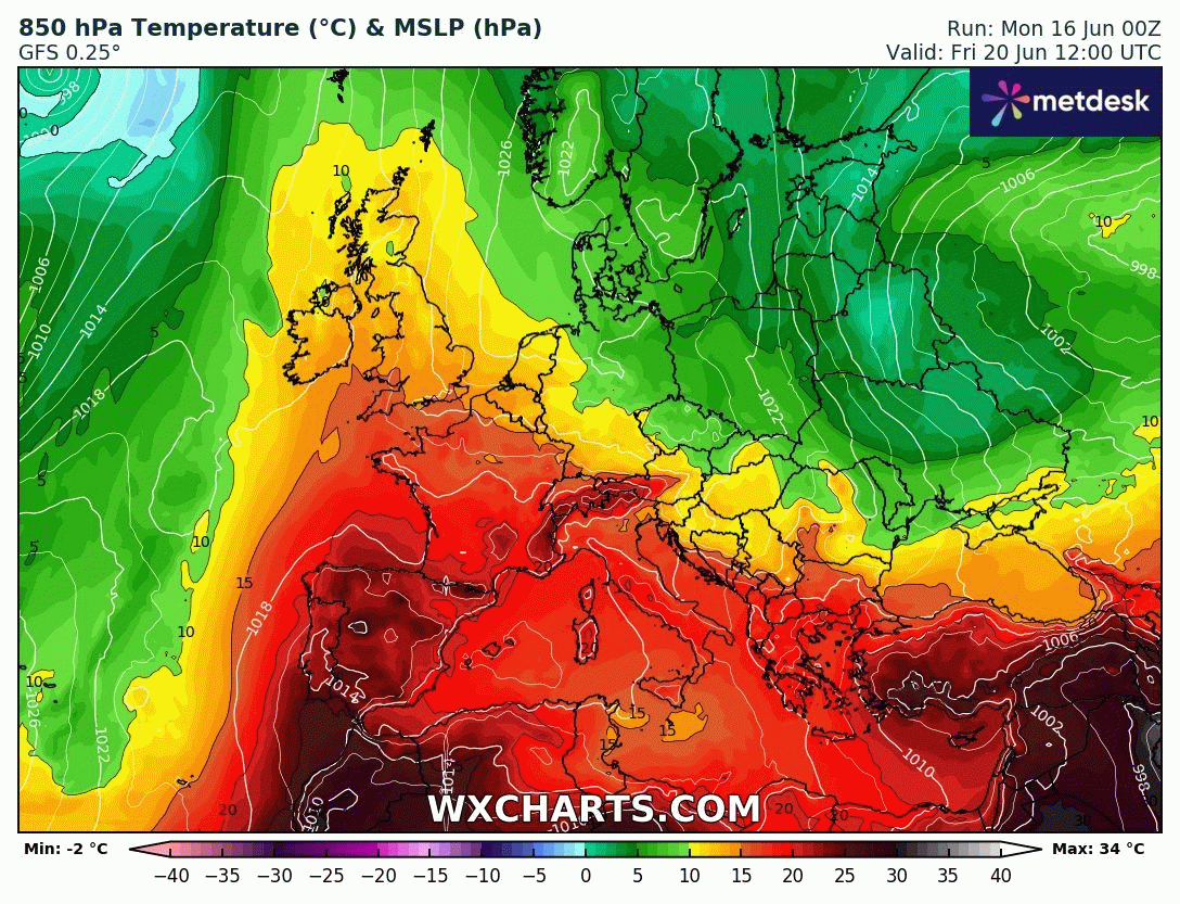 Animation des températures à 850 hPa sur l'Europe du 16 au 22 juin 2025 – Modèle GFS via WX CHARTS