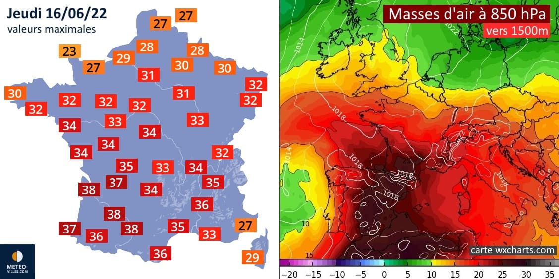 Températures maximales et masses d'air pour le jeudi 16 juin 2022 - Météo Villes & wxcharts.com