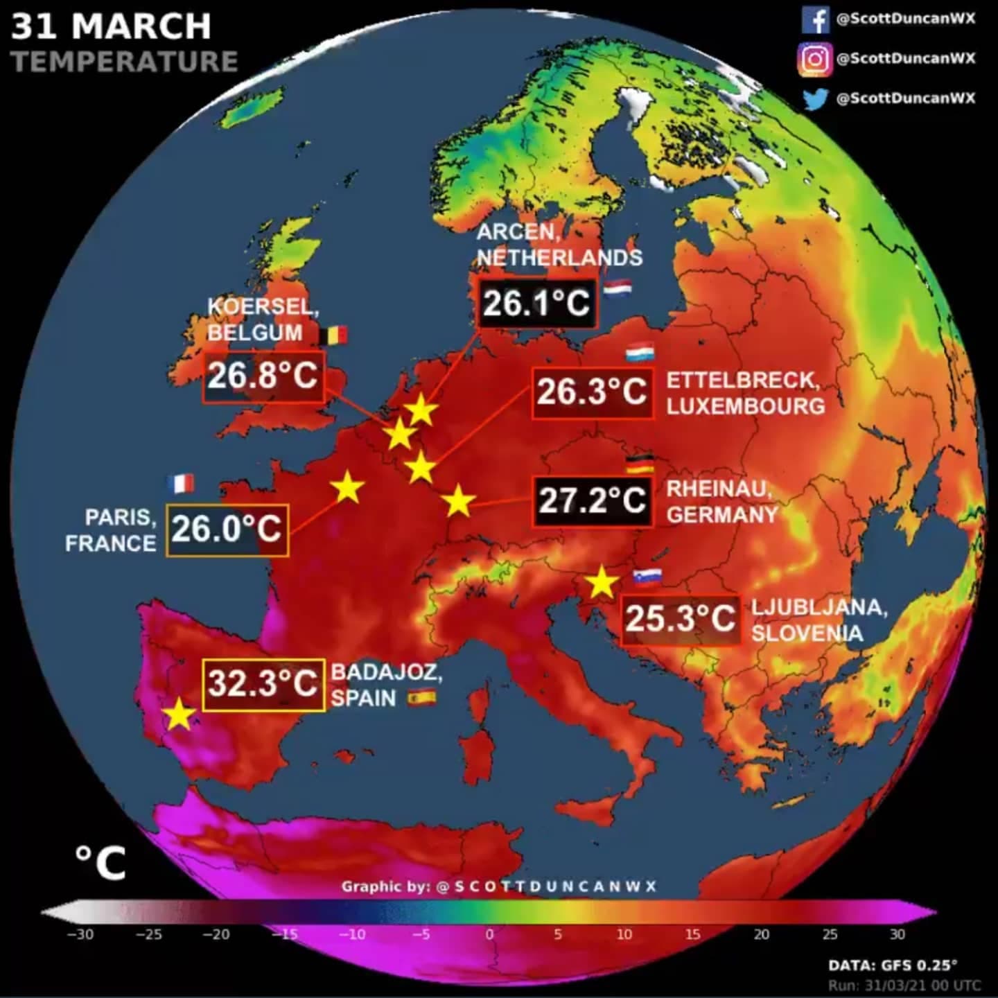 Chaleur exceptionnelle en journée du 31 mars 2021 sur l’Ouest de l’Europe et quelques records associés  - Via Scott Duncan