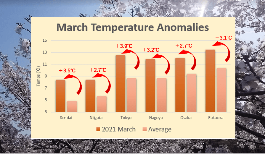 C’est notamment pour cela que la floraison des cerisiers du japon fut exceptionnellement précoce cette année, les conditions étant durablement douces et stables depuis plusieurs semaines sur la région.