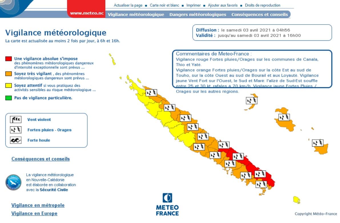 Carte de vigilance du vendredi 2 avril 2021 sur la Nouvelle-Calédonie – Météo-France
