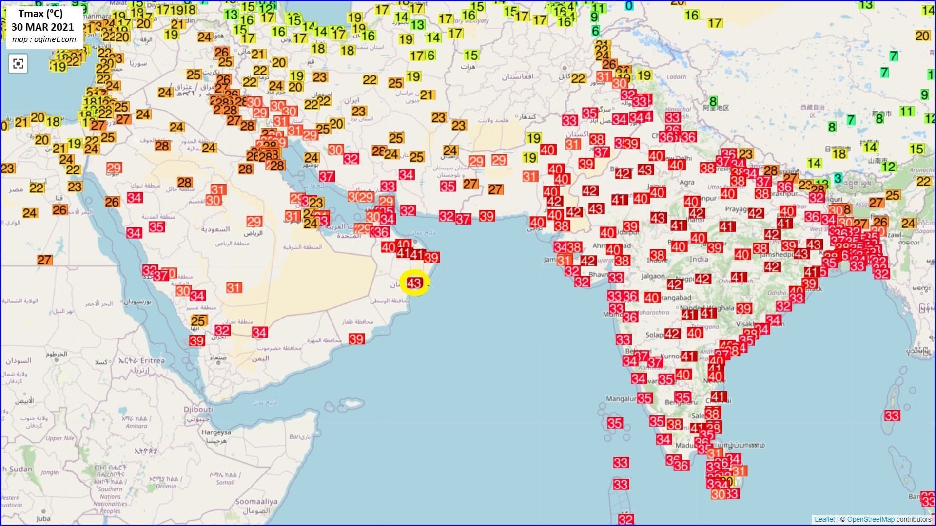 Températures maximales relevées sur le Moyen-Orient et l’Inde ce 30 mars 2021 – Via twitter : @Ekmeteo